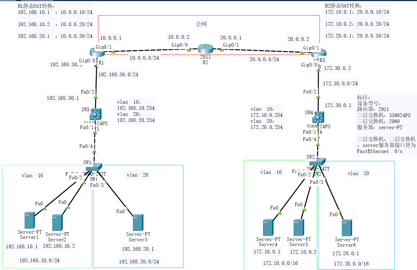 # 核心静态NAT配置:172网段私网IP映射为20.0.0.0/24网段公网IP