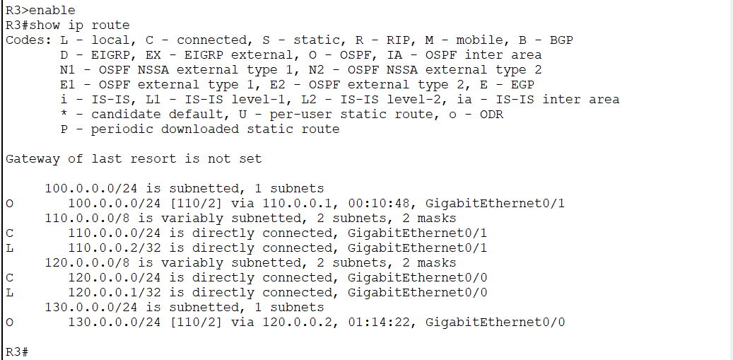 R3(config-router)#network 110.0.0.0 0.0.0.255 area 2 # 宣告网段到中转区域Area 2