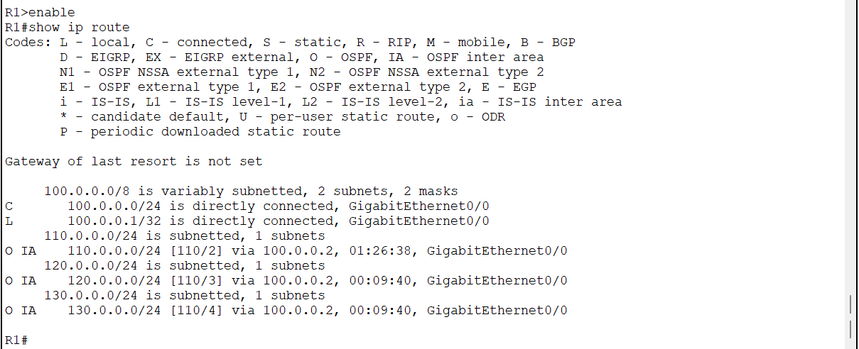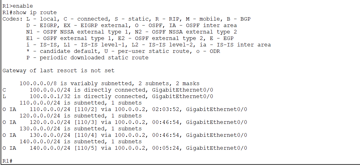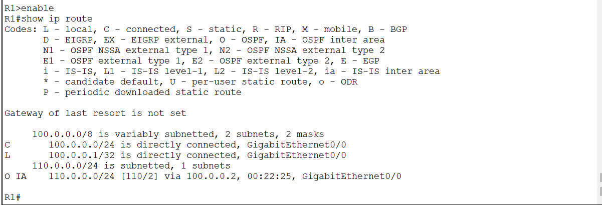 R1(config-router)#network 100.0.0.0 0.0.0.255 area 0 # 宣告网段到骨干区域Area 0