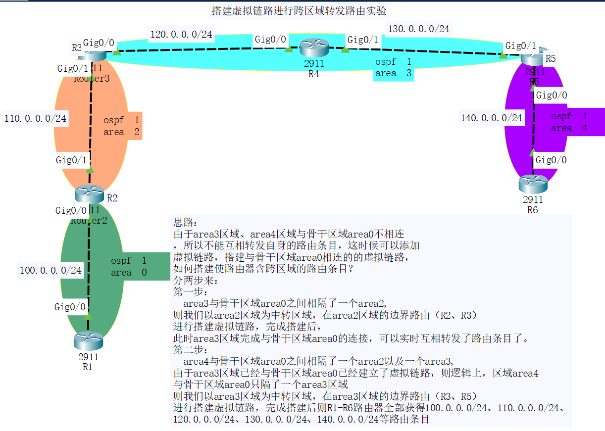 以area2区域为中转区域,中转区域的边界路由器(R2、R3),