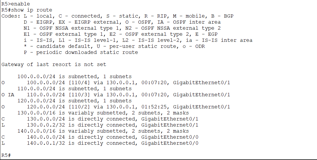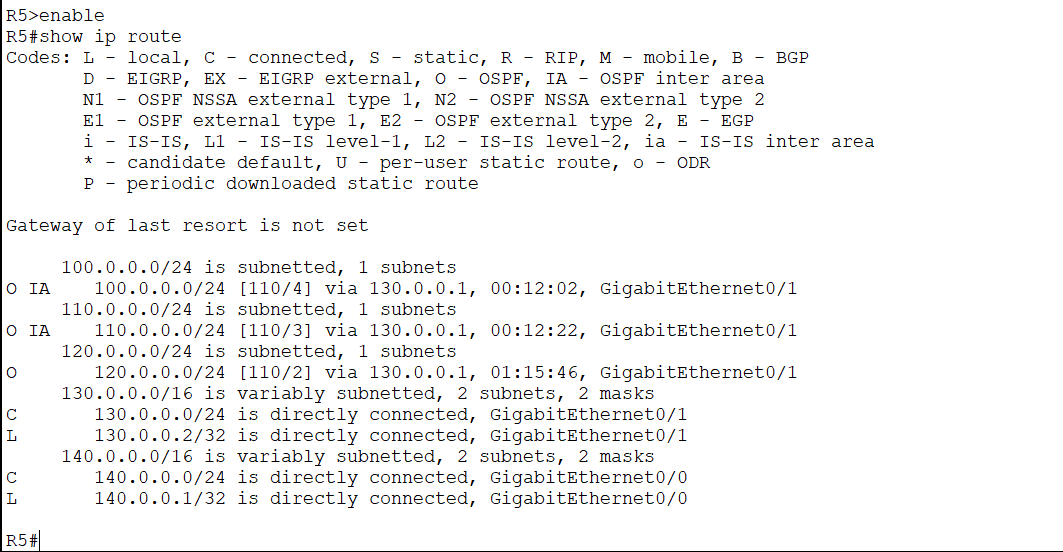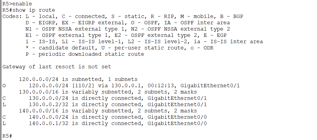 R5(config-router)#network 130.0.0.0 0.0.0.255 area 3 # 宣告网段到中转区域Area 3