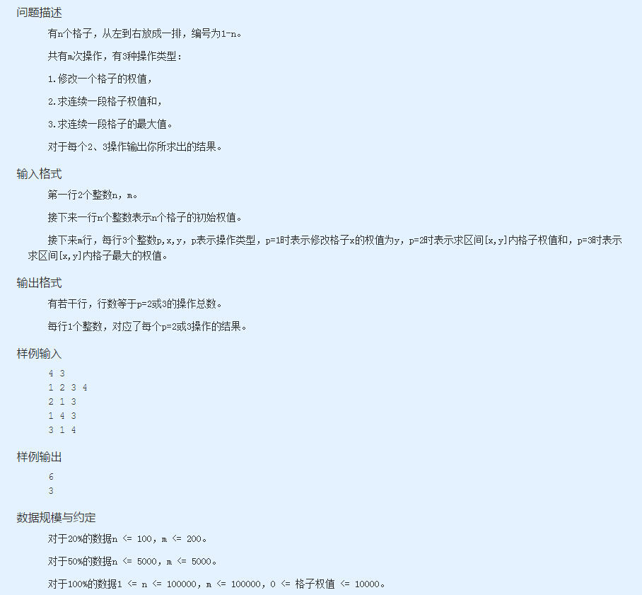 1 #include<stdio.h> 2 #include<stdlib.h> 3 4 //定义结构体:线段树的节点 5 typedef struct SegmentTreeNode 6 { 7 int left,right; //分别用于记录线段区间的左端点和右端点的值 8 int weight_sum,weight_max; //分别用于记录连续一段格子的权值和与连续一段格子的最大值 9 struct SegmentTreeNode *left_child,*right_child; //分别用于指向该线段树节点的左和右子节点 10 }STNode; 11 12 //函数声明 13 STNode *SegmentTreeInit(int left, int right); //线段树初始化 14 int GetMaximum(int a,int b); //得到最大值 15 void SegmentTreeAssignment(STNode *segment_tree_node,int i,int weight); //给线段树中的指定的单元区间节点赋权值 16 void SegmentTreeModification(STNode *segment_tree_node,int i,int weight); //修改指定格子(单元区间节点)的权值 17 int SegmentTreeGetWeightSum(STNode *segment_tree_node,int left,int right); //求连续一段格子的权值和 18 int SegmentTreeGetWeightMaximum(STNode *segment_tree_node,int left,int right); //求连续一段格子的最大值 19 20 //主函数 21 int main() 22 { 23 int i,j; 24 int n,m; //分别用于记录输入的格子的数目和操作的次数 25 STNode *segment_tree_node; //用于指向根据输入的格子数 n 初始化的线段树 [1,n] 26 int weight; //用于记录输入的格子的权值 27 int operation[100000][3]={0}; //用于记录操作类型和参数:operation[][0]:操作序号,operation[][1]:x,operation[][2]:y 28 29 scanf("%d%d",&n,&m); //输入格子的数目 n 和操作的次数 m 30 31 segment_tree_node=SegmentTreeInit(1,n); //线段树初始化 32 33 //初始化权值 34 for(i=1;i<=n;i++) 35 { 36 scanf("%d",&weight); //输入权值 37 SegmentTreeAssignment(segment_tree_node,i,weight); //给线段树中的指定的单元区间节点赋权值 38 } 39 40 //输入 m 次操作并执行 41 for(i=0;i<m;i++) 42 for(j=0;j<3;j++) 43 scanf("%d",&operation[i][j]); //输入操作类型和参数 44 for(i=0;i<m;i++) //执行操作 45 switch(operation[i][0]) 46 { 47 case 1:SegmentTreeModification(segment_tree_node,operation[i][1],operation[i][2]); break; //修改指定格子(单元区间节点)的权值 48 case 2:printf("%d\n",SegmentTreeGetWeightSum(segment_tree_node,operation[i][1],operation[i][2])); break; //求连续一段格子的权值和 49 case 3:printf("%d\n",SegmentTreeGetWeightMaximum(segment_tree_node,operation[i][1],operation[i][2])); break; //求连续一段格子的最大值 50 default:break; 51 } 52 53 return 0; 54 } 55 56 /********************************************************************************************************* 57 ** 函数功能 :线段树初始化 58 ** 函数说明 :无 59 ** 入口参数 :left:线段树当前节点的区间左端点值 60 ** :right:线段树当前节点的区间右端点值 61 ** 出口参数 :指向该线段树的指针(初始化后的线段树的第一个节点的地址) 62 *********************************************************************************************************/ 63 STNode *SegmentTreeInit(int left,int right) 64 { 65 STNode *segment_tree_node=(STNode *)malloc(sizeof(STNode)); //申请 sizeof(STNode) 大小的内存空间,新建一个线段树节点 66 67 segment_tree_node->left=left; //新建节点的区间左端点赋初值 left 68 segment_tree_node->right=right; //新建节点的区间右端点赋初值 right 69 segment_tree_node->weight_sum=0; //新建节点中记录的连续一段格子的权值和赋初值 0 70 segment_tree_node->weight_max=0; //新建节点中记录的连续一段格子的权值最大值赋初值 0 71 segment_tree_node->left_child=NULL; //新建节点中指向其左子节点的指针赋初值 NULL 72 segment_tree_node->right_child=NULL; //新建节点中指向其右子节点的指针赋初值 NULL 73 74 if(right!=left) //如果新建的节点的区间不是单元区间,则线段树未完成初始化,继续分割区间 75 { 76 int middle=(left+right)/2; //获得新建节点区间的中值 77 segment_tree_node->left_child=SegmentTreeInit(left,middle); //继续初始化新建节点的左子树 78 segment_tree_node->right_child=SegmentTreeInit(middle+1,right); //继续初始化新建节点的右子树 79 } 80 81 return segment_tree_node; //返回指向该线段树的指针(初始化后的线段树的第一个节点的地址) 82 } 83 84 /********************************************************************************************************* 85 ** 函数功能 :得到最大值 86 ** 函数说明 :无 87 ** 入口参数 :a、b:进行比较的数 88 ** 出口参数 :比较后的最大值 89 *********************************************************************************************************/ 90 int GetMaximum(int a,int b) 91 { 92 if(a>b) 93 return a; 94 else 95 return b; 96 } 97 98 /********************************************************************************************************* 99 ** 函数功能 :给线段树中的指定的单元区间节点赋权值 100 ** 函数说明 :在给指定单元区间节点赋权值的同时,更新包含该单元区间节点的区间节点的权值和与最大值 101 ** 入口参数 :segment_tree_node:指向线段树的指针 102 :i:要赋权值线段树的单元区间节点 i 103 ** :weight:要赋的权值 104 ** 出口参数 :无 105 *********************************************************************************************************/ 106 void SegmentTreeAssignment(STNode *segment_tree_node,int i,int weight) 107 { 108 segment_tree_node->weight_sum+=weight; //更新包含单元区间节点 i 的区间节点中的权值和 109 segment_tree_node->weight_max=GetMaximum(segment_tree_node->weight_max,weight); //更新包含单元区间节点 i 的区间节点中的权值最大值 110 111 //寻找单元区间节点 i 112 if(segment_tree_node->left==segment_tree_node->right) //搜索到单元区间节点 i 113 return; 114 else //没有,继续搜索 115 if (i<=(segment_tree_node->left+segment_tree_node->right)/2) 116 SegmentTreeAssig