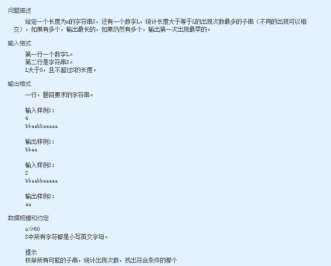 1 #include<stdio.h> 2 #include<string.h> 3 4 //定义子串参数结构体 5 struct sub_str 6 { 7 char sstr[61]; //子串 8 int len; //子串长度 9 int times; //子串出现的次数 10 }; 11 12 int main() 13 { 14 int i,j,k; 15 int l,l_temp; //l:用于记录输入的要统计的子串的最小长度;l_temp:用于记录遍历子串时的临时动态子串长度 16 char str[61],sstr_temp[61]; //str:用于指向输入的要统计的字符串;sstr_temp:用于指向当前统计的子串 17 int str_len; //用于记录输入的要统计的字符串的长度 18 struct sub_str substr[1830]; //substr[1830]:用于记录各个子串的参数,最多有1+2+3+···+60个子串 19 struct sub_str substr_temp; //substr_temp:用于对substr[1830]中的子串进行排序时交换顺序的临时中间结构体变量 20 int sstr_num=0; //用于统计存入substr[1830]中的实际子串数量 21 int max_times; //用于记录子串出现的最大次数 22 23 //输入 24 scanf("%d",&l); //输入统计的子串的最小长度 25 getchar(); //除去输入时的回车键 26 gets(str); //输入要统计的字符串 27 28 str_len=strlen(str); //得到输入的要统计的字符串的长度 29 30 //初始临时动态子串长度为最大长度,遍历要统计的字符串中满足长度的子串 31 for(l_temp=str_len;l_temp>=l;l_temp--) 32 { 33 for(i=0;i<str_len-l_temp;i++) //长度为l_temp的子串在长度为str_len的字符串中有str_len-l_temp个 34 { 35 for(j=i,k=0;j<i+l_temp;j++,k++) //得到当前要统计的子串 36 sstr_temp[k]=str[j]; 37 38 for(k=0;k<sstr_num;k++) //查询 substr[1830] 中是否存在当前要统计的子串 39 if(strcmp(sstr_temp,substr[k].sstr)==0) //有,则使该子串的出现次数加1 40 { 41 substr[k].times++; 42 break; 43 } 44 45 if(k==sstr_num) //没有,则在 substr[1830] 中新增该子串,并初始化各个参数 46 { 47 strcpy(substr[sstr_num].sstr,sstr_temp); 48 substr[sstr_num].len=l_temp; 49 substr[sstr_num].times=1; 50 sstr_num++; // substr[1830] 中实际的子串数量加1 51 } 52 53 memset(sstr_temp,0,sizeof(sstr_temp)); //清 0 sstr_temp[61],继续遍历该长度的子串 54 } 55 } 56 57 //采用冒泡排序法对 substr[1830] 中的子串根据出现次数进行排序 58 for(i=0;i<sstr_num-1;i++) 59 { 60 for(j=i;j<sstr_num;j++) 61 { 62 if(substr[j].times>substr[i].times) 63 { 64 for(k=0;k<61;k++) 65 substr_temp.sstr[k]=substr[i].sstr[k]; 66 substr_temp.len=substr[i].len; 67 substr_temp.times=substr[i].times; 68 69 for(k=0;k<61;k++) 70 substr[i].sstr[k]=substr[j].sstr[k]; 71 substr[i].len=substr[j].len; 72 substr[i].times=substr[j].times; 73 74 for(k=0;k<61;k++) 75 substr[j].sstr[k]=substr_temp.sstr[k]; 76 substr[j].len=substr_temp.len; 77 substr[j].times=substr_temp.times; 78 } 79 } 80 } 81 82 //输出 83 puts(substr[0].sstr); 84 85 return 0; 86 }