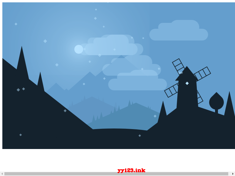 css3绘制的山坡上的小屋风车,云朵飘动场景特效。