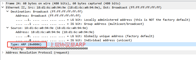 - 广播(Broadcast):目标MAC地址是 FF:FF:FF:FF:FF:FF,表示该数据包是发往网络上所有设备的。