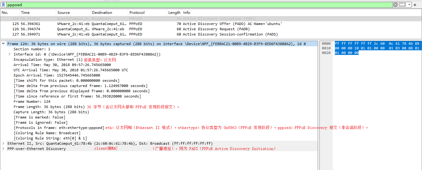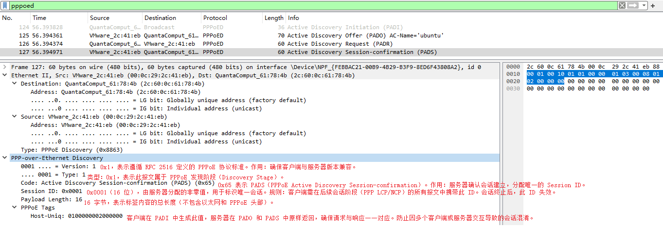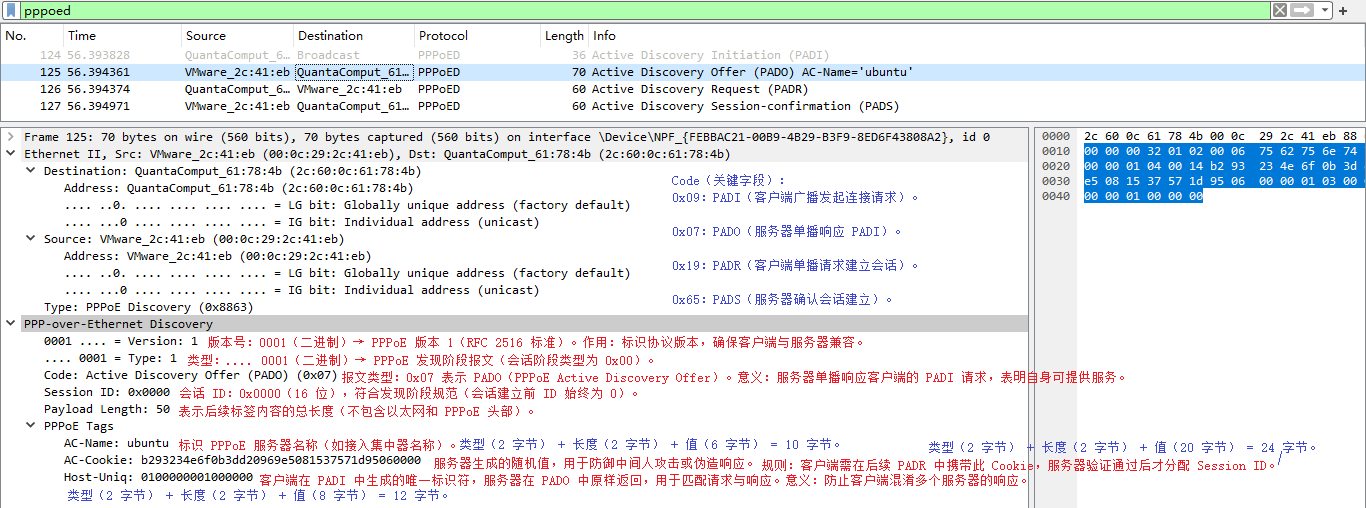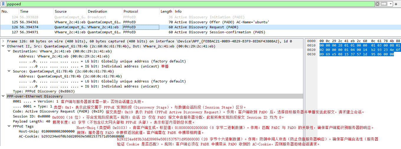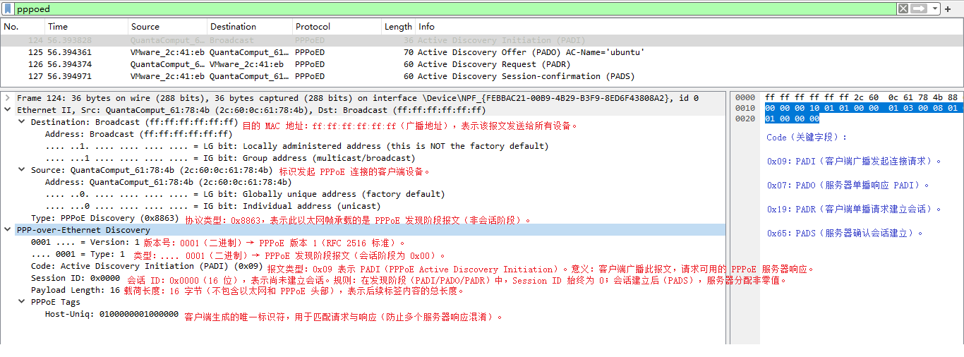 发现阶段(Discovery Stage):通过广播交互 `PADI`、`PADO`、`PADR`、`PADS` 报文,建立客户端与服务器的会话标识(Session ID)。