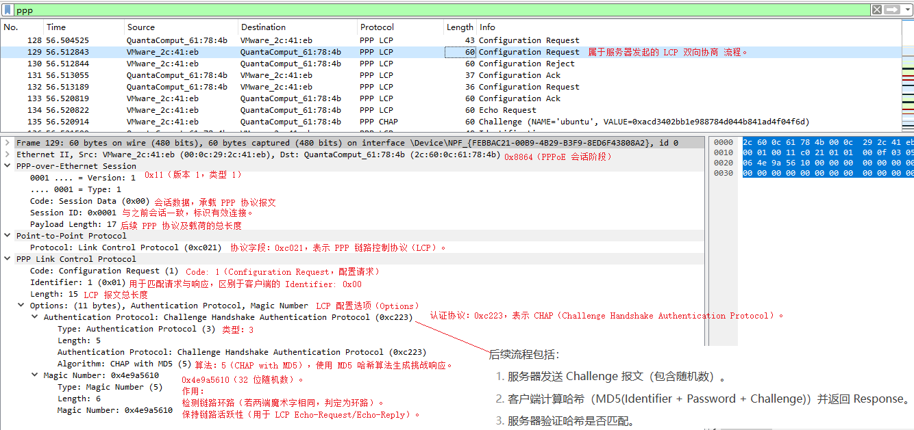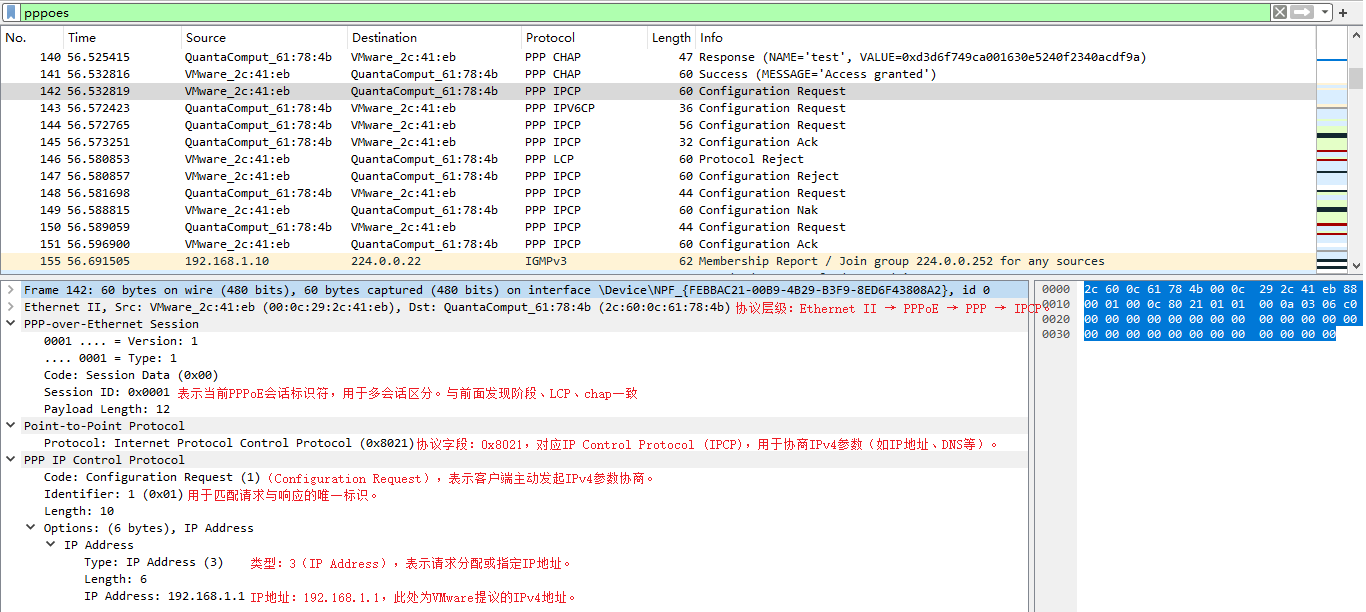 会话阶段(Session Stage):基于 PPP 协议进行数据传输,包括 LCP(链路控制协议)、认证(PAP/CHAP/EAP)、NCP(网络控制协议,如 IPCP 分配 IP 地址)。
