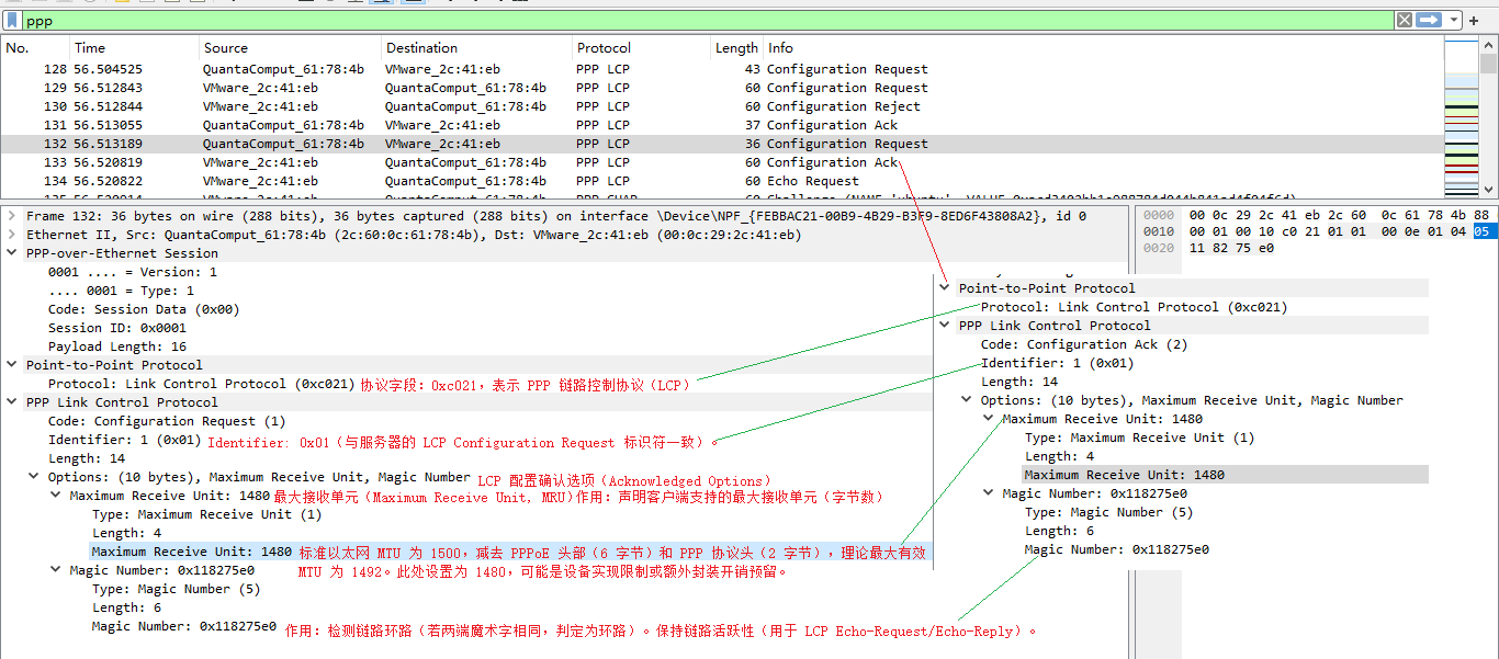 - LCP 协商:验证链路参数(MTU、认证协议)协商是否正常。