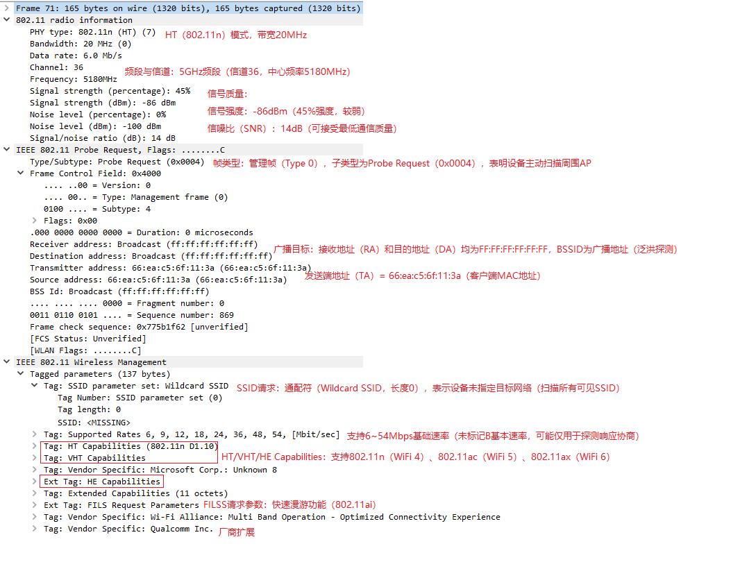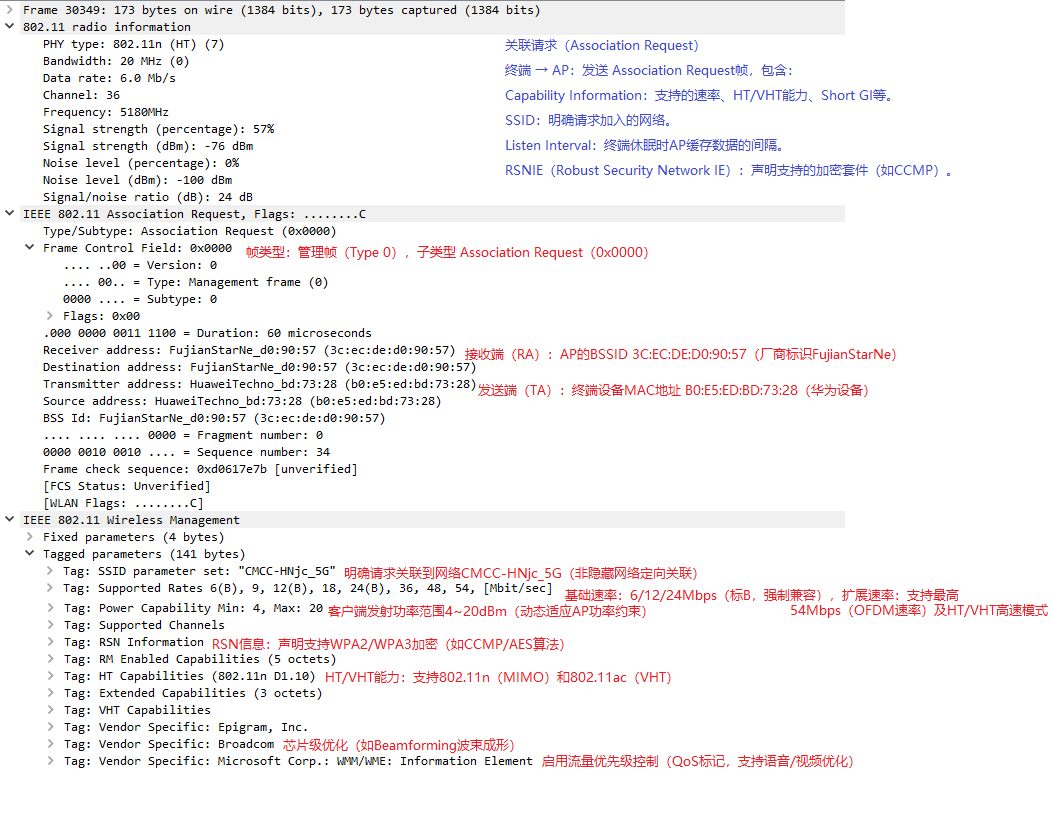 HT/VHT Capabilities:如果设备支持802.11n (HT, High Throughput) 或802.11ac/ax (VHT, Very High Throughput),它会在关联请求中包含这些信息,以允许AP使用更高效的技术来优化传输性能 (如 MIMO、多信道聚合等)。