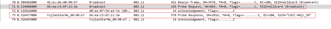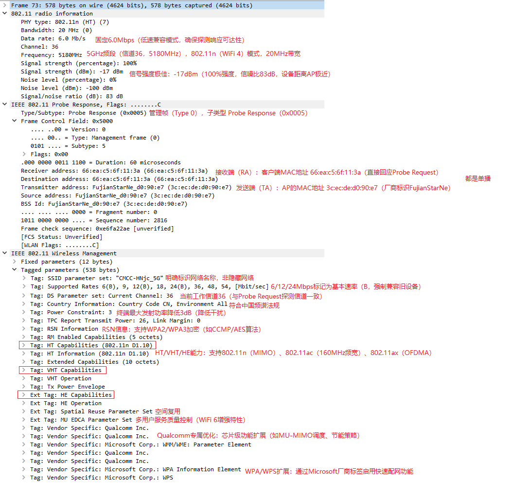 AP在接收到探测请求后,会返回探测响应帧 (Probe Response) 。这个响应帧包含AP的详细信息,例如: