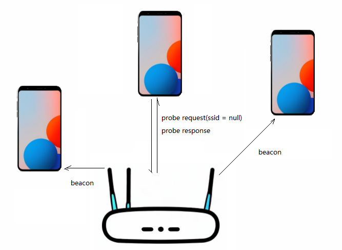 终端设备(用户的wifi设备)会主动向周围的无线信道发送探测请求 (Probe Request) ,并等待 AP 发送探测响应 (Probe Response) 。快速发现周围的 WiFi 网络,尤其是在设备不知道有哪些网络可用的情况下(wifi列表可见ssid)。 主动扫描的过程分为以下几个步骤: