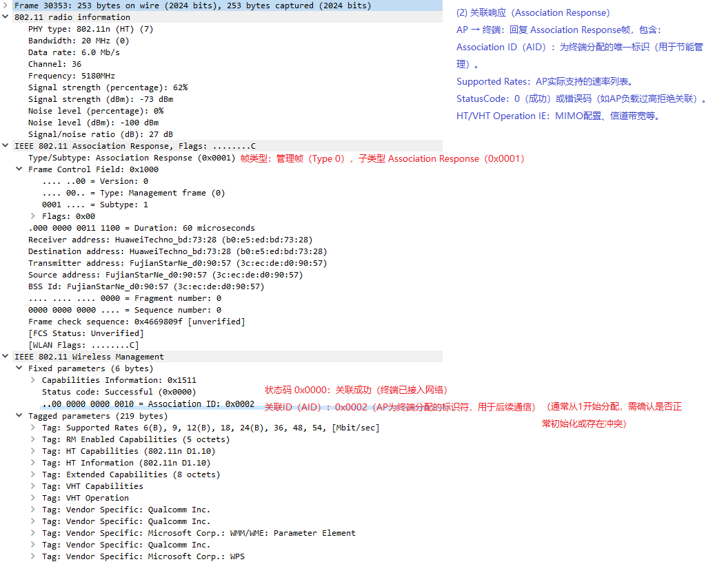 状态码 (Status Code):指示关联是否成功。如果状态码为0,表示关联成功;否则,设备需要重新尝试。