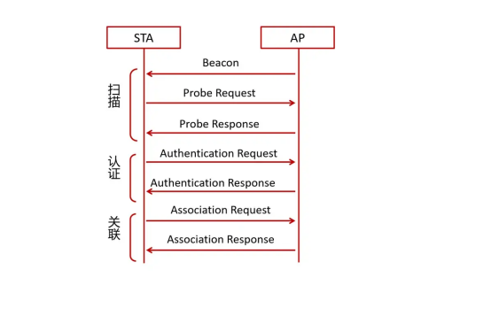 (1)扫描阶段 (Scanning) ,设备通过扫描找到可用的无线接入点 (Access Point, AP) ,从而选择合适的 AP 进行连接。WiFi 标准中定义了两种主要的扫描方式:主动扫描 (Active Scanning) 和被动扫描 (Passive Scanning) 。