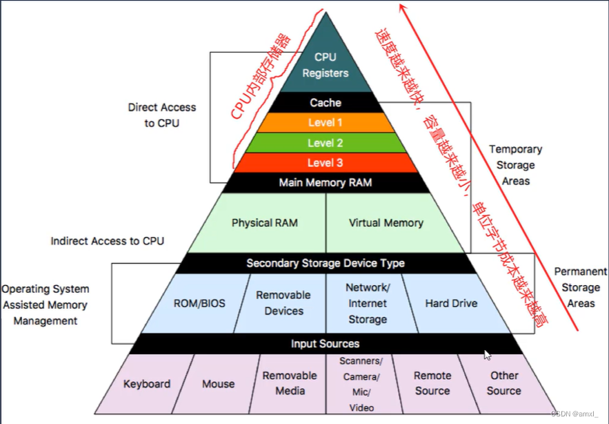 (CPU处理数据<-寄存器<-缓存)<-内存<-外存 <-数据