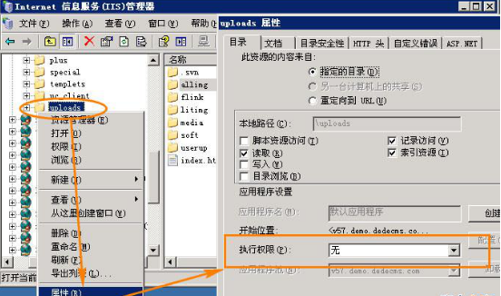 打开IIS中站点,在站点uploads目录、data目录以及静态html生成目录点击右键,菜单中选择“属性”,在目录属性面板选择执行权限为“无”即可。
