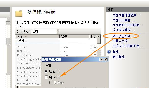 限制IIS7的目录执行权限的本质,就是在编辑功能权限之后,会在所在目录建立一个web.config,通过里面的配置来限制该目录的权限,所以,当该目录已经有web.config的时候,建议先查看一下配置,然后在web.config下直接添加,添加代码下面的参考解决办法2。