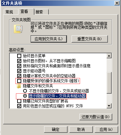 打开电脑文件夹选项卡,取消”隐藏受保护的操作系统文件“勾选,把”隐藏文件和文件夹“下面的单选选择“显示隐藏的文件、文件夹和驱动器”。