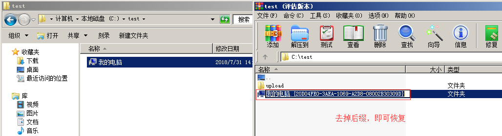 如何打开这个文件夹:我们先用WinRAR找到这个文件夹,然后重命名文件夹把后缀的“.{20D04FE0-3AEA-1069-A2D8-08002B30309D}”删除。