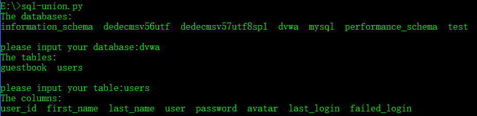 union select 实现起来最为简单,报错注入的实现方式也基本一致,主要思路:获取所有数据库名--选择数据库--查看这个数据库下所有表---选择表--查询这个表下所有列名。