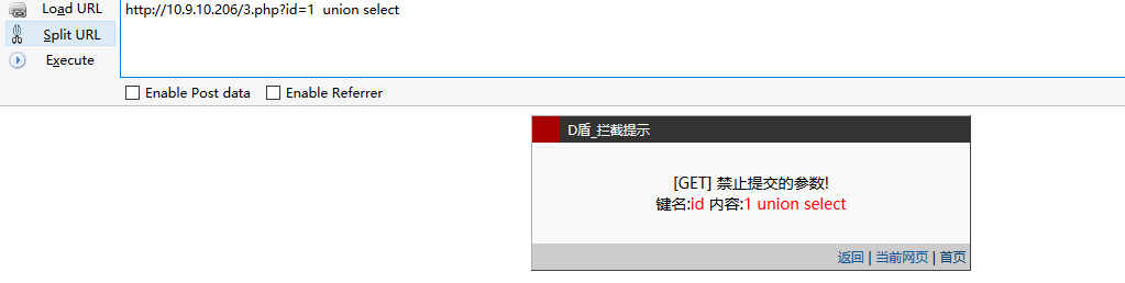 搭建IIS+ASP/ASPX+MSSQL环境,思路一致,只是语言与数据库特性有些许差异,继续来张D盾拦截图: