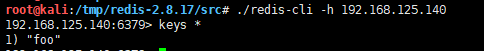 root@kali:/tmp/redis-2.8.17/src# ./redis-cli -h 192.168.125.140 192.168.125.140:6379> ping PONG 192.168.125.140:6379>