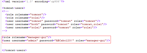 备份配置文件,修改tomcat/conf/tomcat-user.xml配置文件,将账号进行注释,