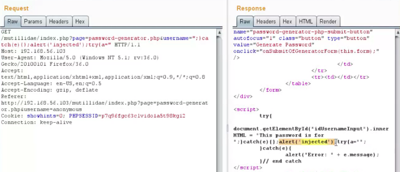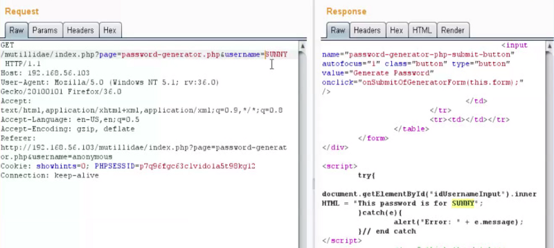 我们打开我们的burp-suite并在我们的代理选项卡中拦截请求。我们将其发送到转发器选项卡以检查请求查询和相应的响应查询。下面的图像是我们传递的第一个请求,我们可以观察到我们在请求查询中传递的用户名会反映在响应查询中。