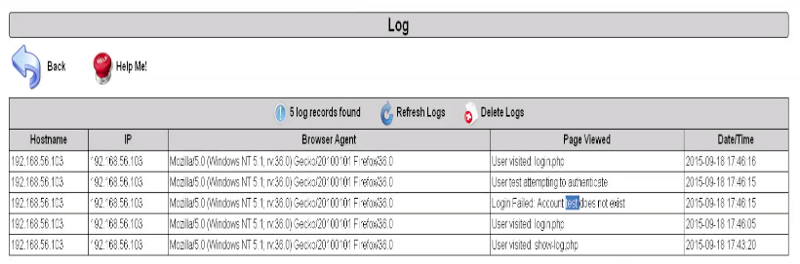 在我们旁边的登录页面中,输入test作为用户名和密码。我们所做的每件事都记录在日志数据库中。我们可以继续检查日志数据库,在那里我们可以看到注册了测试用户名的失败登录尝试。因此,如果用户名没有被清理并直接保存在日志中,那么我们可以利用它来发起存储的XSS攻击。