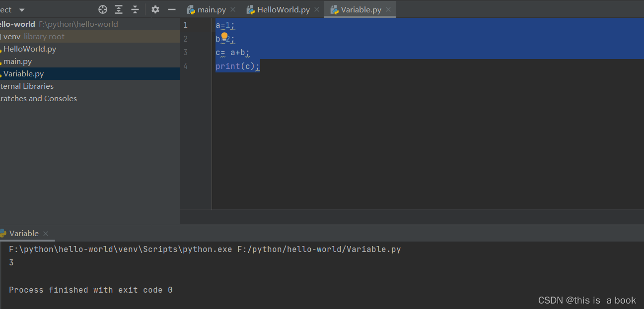 定义1个变量 a ,值是1,定义1个变量b,值是2,计算a+b, 用变量c接收,并且打印