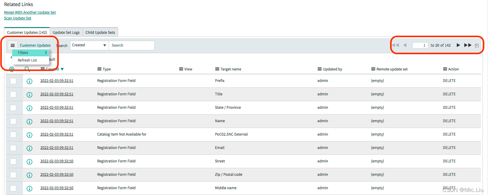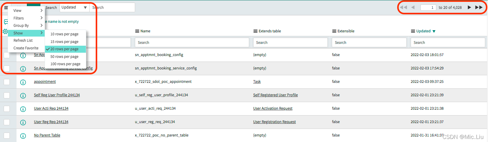 Servicenow在显示列表项目时,有的可以调节每页显示的记录数,用户可以根据自己的需要进行调整,如下图中可以选择10条-15条-20条-50条-100条。