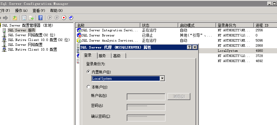 在弹出的对话框中选择"内置账户“->LocalSystem即可。