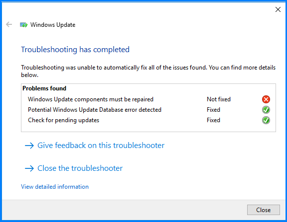 7、修复结果如下图,windows update components must be repaired 没有被修复成功