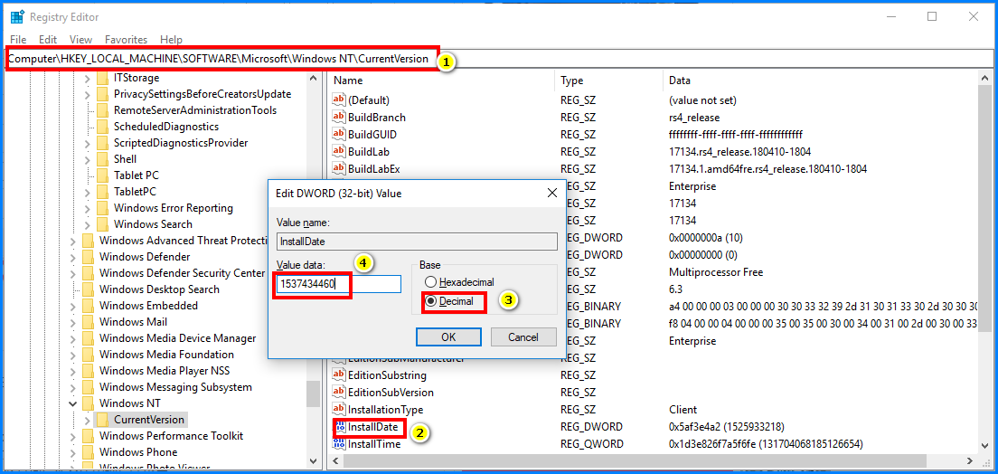 3、找到CurrentVersion右侧的InstallDate,该项保存的是初次安装该系统时的日期值,切换十进制,然后该值就是unix时间戳,这个值可以通过网上搜索进行时间转换。https://unixtime.51240.com/