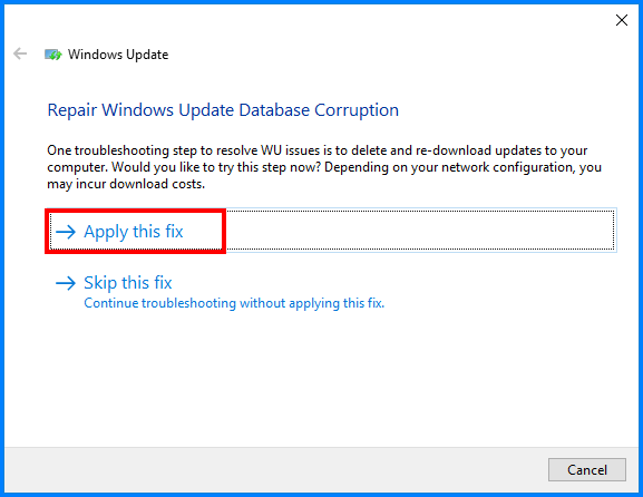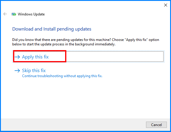 6、如果没有按照方法一操作,这里也会检测推荐使用方法一将已下载到本地计算机的更新文件删除,我们选择Apply this fix(应用此修复程序)