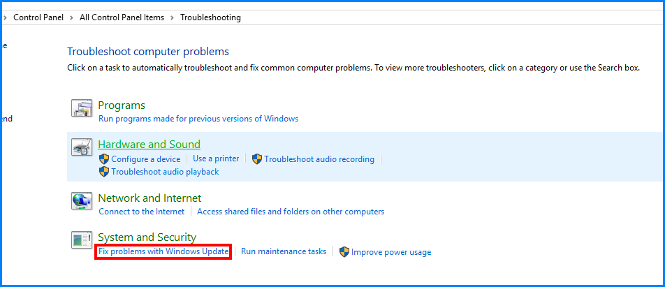 2、找到 troubleshooting----System and Security---Fix Problems with windows update