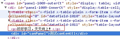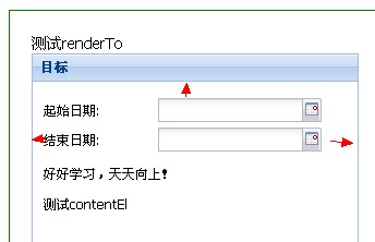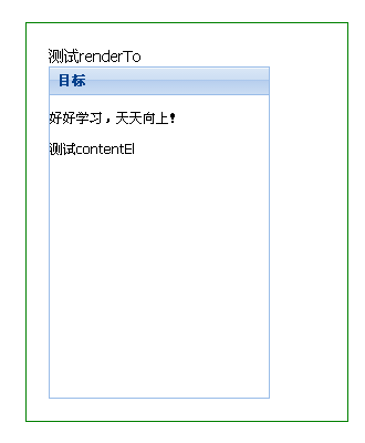 Ext.onReady(function(){ Ext.create('Ext.panel.Panel',{ title:'目标', width:200, height:300, html:'<p>好好学习,天天向上!</p>', contentEl:"conPanel", renderTo:Ext.get("addPanel") //常用的还有Ext.getBody() }); });