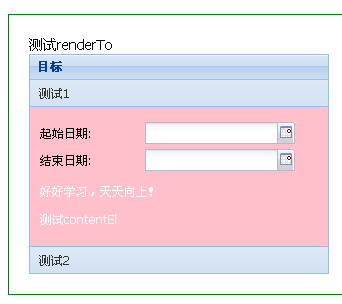 var myPanel=Ext.create('Ext.panel.Panel',{ bodyPadding: "15px 10px 0 10px", //距离边框的距离 title:'目标', width:300, height:220, html:'<p>好好学习,天天向上!</p>', bodyStyle:'background:pink;color:white',//添加style tbar:[ { xtype: 'button', text: '测试1',handler:function(){ Ext.MessageBox.alert(myPanel.title,"测试1"); } } ], bbar:[ { xtype: 'button', text: '测试2',handler:function(){ Ext.MessageBox.alert(myPanel.title,"测试2"); } } ], /* dockedItems: [{ xtype: 'toolbar', dock: 'top', buttonAlign:'right', items: [ { xtype: 'button', text: 'Top 1',handler:function(){//content}}, { xtype: 'button', text: 'Top 2' } ] }, { xtype: 'toolbar', dock: 'bottom', items: [ { xtype: 'button', text: 'Bottom 1' }, { xtype: 'button', text: 'Bottom 2' } ] }], 上面按钮的写法也可以这样来*/ items: [{ xtype: 'datefield', fieldLabel: '起始日期' }, { xtype: 'datefield', fieldLabel: '结束日期' }], //子项 contentEl:"conPanel", renderTo:Ext.get("addPanel") //常用的还有Ext.getBody() });