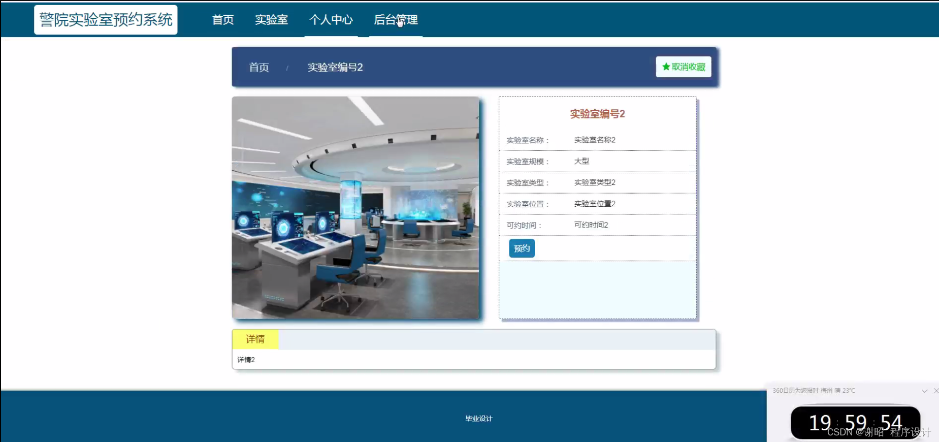 选题背景: 在现代社会中,实验室预约系统的应用已经成为各个领域的常态化需求。警院作为一所高等学府,拥有众多实验室资源,为了更好地管理和利用这些资源,开发一个高效的实验室预约系统势在必行。传统的实验室预约方式存在着许多问题,比如预约流程繁琐、信息传递不及时、资源利用率低下等。因此,通过引入先进的技术手段,建立一个智能化的实验室预约系统,可以有效解决这些问题,提高实验室资源的利用效率,提升教学科研水平。