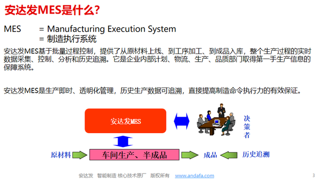安达发MES基于批量过程控制,提供了原材料上线,到工序加工,到成品入库,整个生产过程的实施数据采集、控制、分析和历史追溯。可以保障企业内部计划、物流、生产、品质部门取得第一手生产信息。