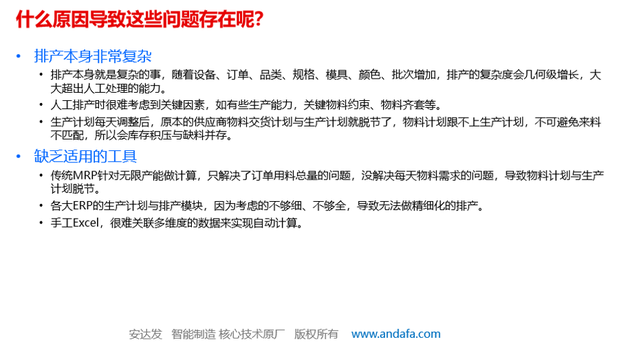 • 安达发APS主要解决:客户订单交期评估与答复、人工排产效率低、设备资源利用率低、物料计划与生产计划脱节、生产计划执行率低、库存积压与生产缺料等相关问题。