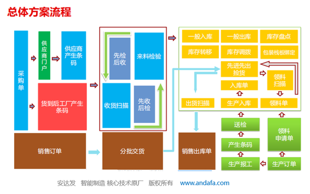 安达发WMS智能仓储系统,经过十八年的行业经验积累,为仓库管理信息化、智能化提供针对性的解决方案,具体方案流程如图所示: