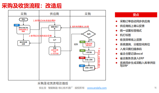 对仓库进行改造后,可采购部门与供应商可以通过使用SCM系统自动同步来接受采购订单、自动反馈生产过程,从而对包装进行统一标签格式的机打标签;经过供应商验货后,有问题就可以与采购部门进行线上处理,进一步通过系统分配货位,实现自动产生并同步单据。同样的,对于委外订单,委外发料、收货和退货等流程和采购流程是一致的。