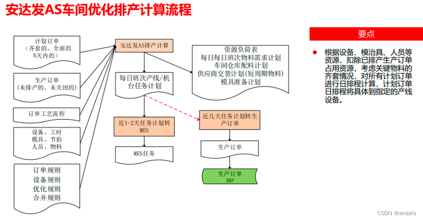1. AP工厂高级计划 中长期的生产净需求。考虑客户订单、销售预测Forecast、交货计 划、库存、在途、在制、工厂生产能力、成本、生产提前期、生产 周期等,扣库存、展BOM,最终产生每个工厂的未来的生产净需 求量,即计划订单。